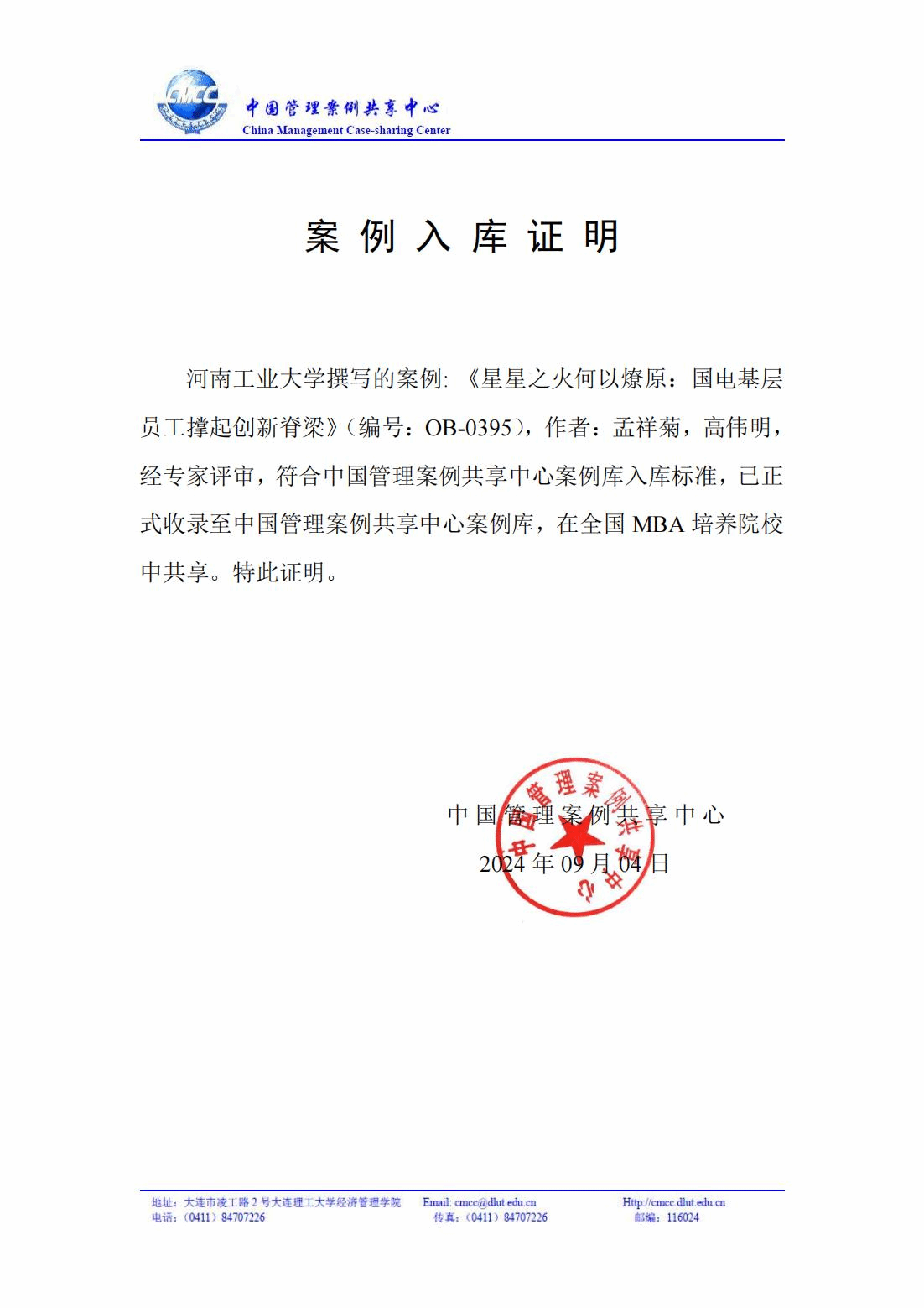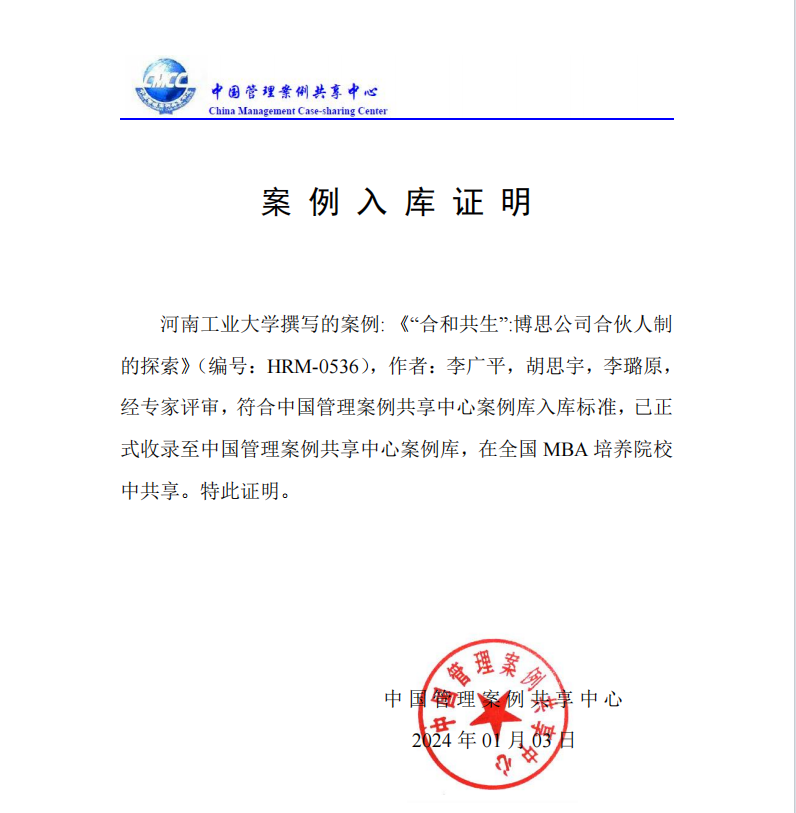 2024年1月2日,由河南省教学名师、工商管理系李广平教授与研究生合作撰写的案例《“合和共生”:博思公司合伙人制的探索》被收录至中国管理案例共享中心“人力资源管理”门类。2024年9月2日,由工商管理系孟祥菊副教授与高伟明博士联合撰写的案例《星星之火何以燎原:国电基层员工撑起创新脊梁》被中国管理案例共享中心收录,隶属于“组织行为学”。