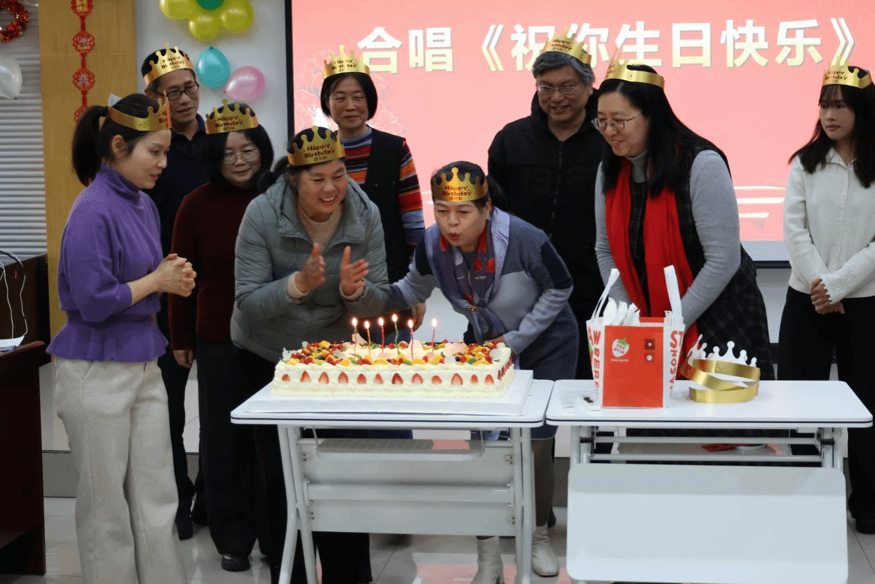 随后,学院领导为寿星们佩戴生日帽、合影留念。烛光摇曳中,全场齐唱生日歌,寿星们许下美好心愿、吹灭蜡烛。工会委员与工会小组长有序分切、传递蛋糕,香甜滋味交织着真挚情谊,定格下温馨瞬间。