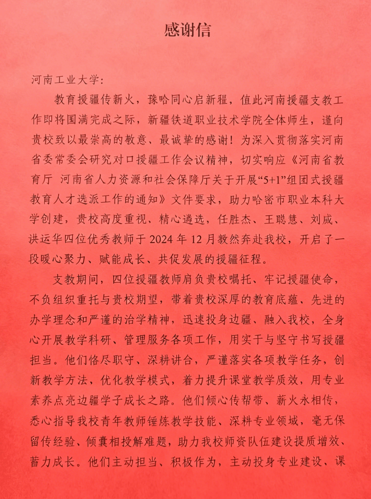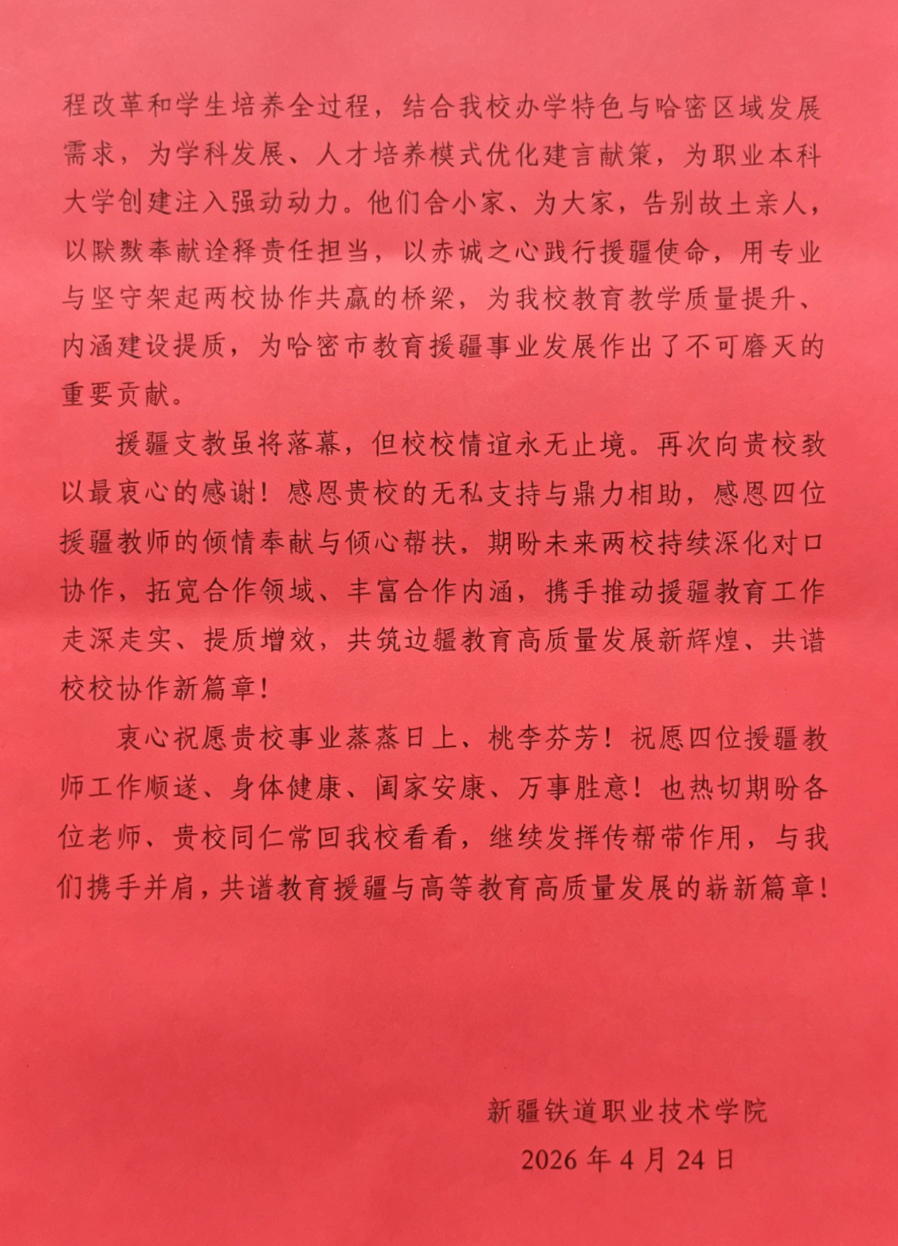 新疆铁道职业技术学院专门致信我校,对四名援疆教师的突出表现和我校的大力支持表示衷心感谢。下一步,我校将继续深入落实国家对口援疆战略,不断深化与受援学校的交流合作,持续提升教育援疆工作质效,为推动边疆职业教育高质量发展贡献更大力量。