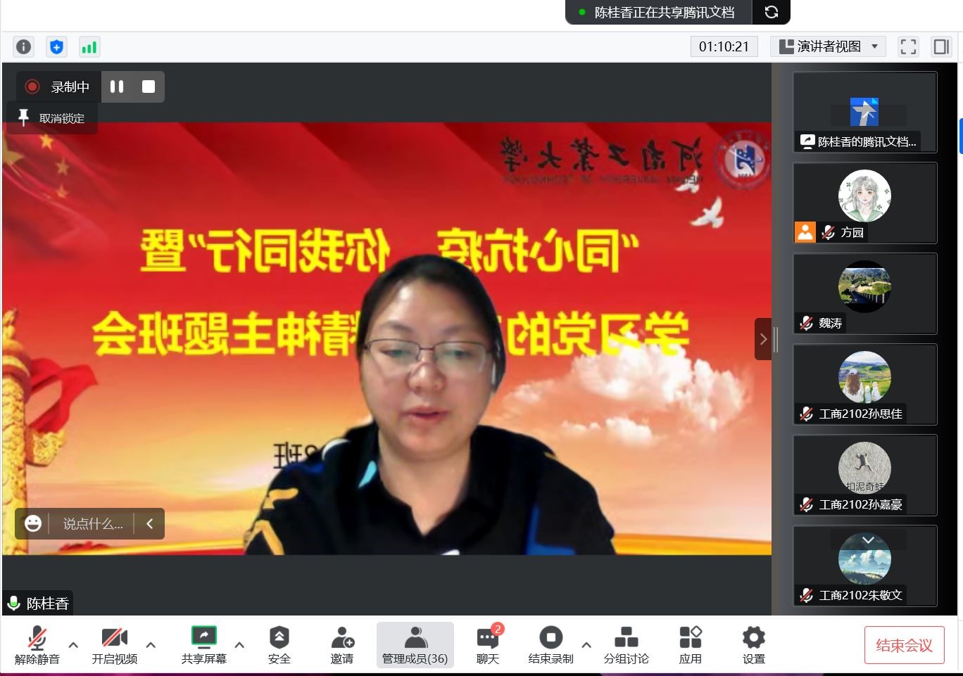 11月29日晚,副校长陈桂香与工商管理2102班全体同学通过腾讯会议线上召开“同心抗疫,你我同行” 暨学习党的二十大精神主题班会,为同学们了解党的二十大精神、珍惜来之不易的抗疫成果、携手努力打赢校园疫情防控保卫战加油鼓劲。亚洲无码