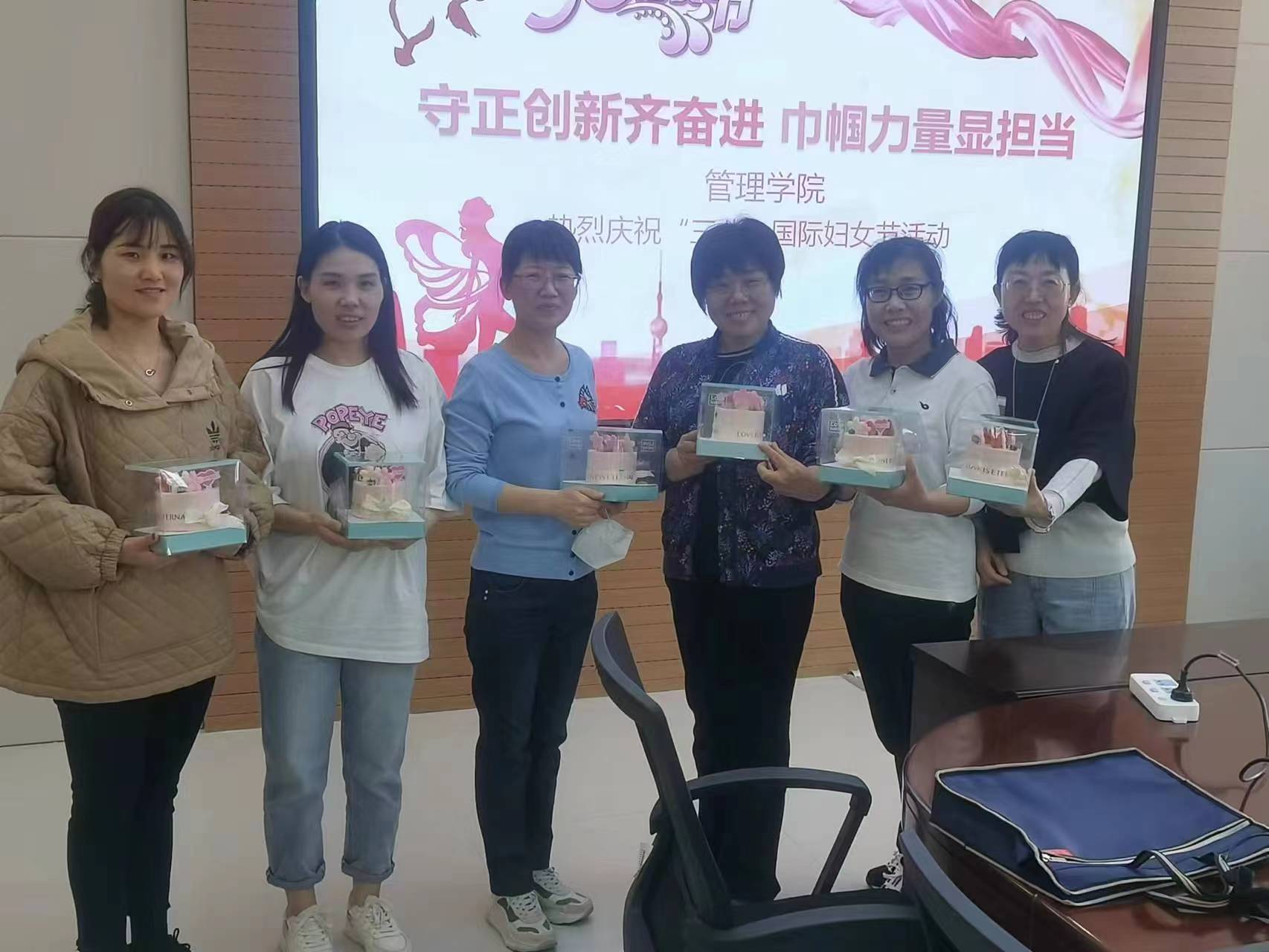 在3558活动室举行女教师“庆祝三八节,书香伴我行”读书分享活动,学院的女教师们参加了活动,学院工会为每位女教师精心准备了节日蛋糕。