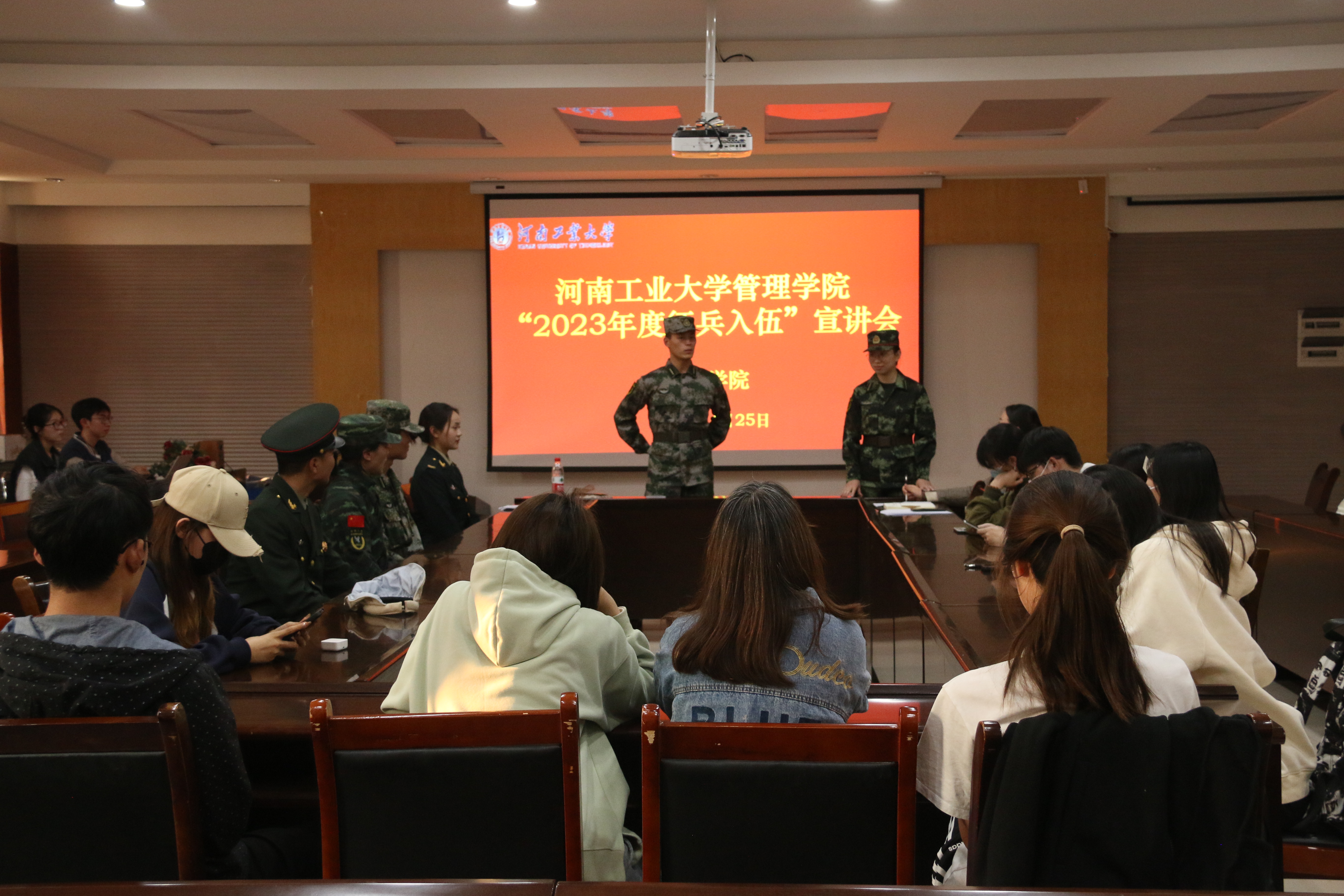 在3543会议室举行“2023年征兵入伍政策”宣讲会。我校退役大学生杜梦可、刘怡新、张汉豪、李长洁、申榆等征兵宣讲团成员、学院全体辅导员及各年级有参军入伍意愿的在校生参与了宣讲会。