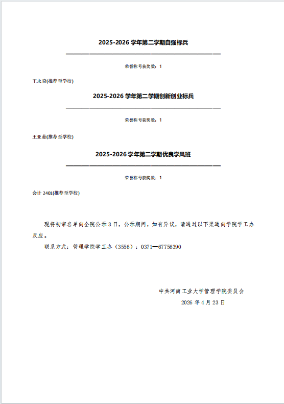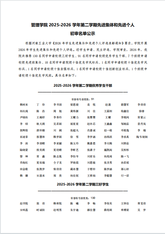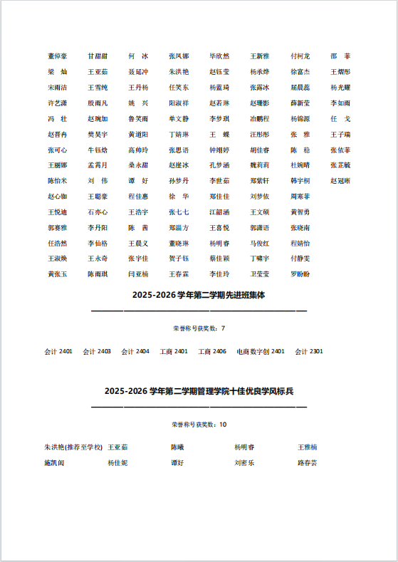 亚洲无码 2025-2026学年第二学期先进集体和先进个人初审名单公示