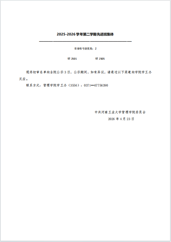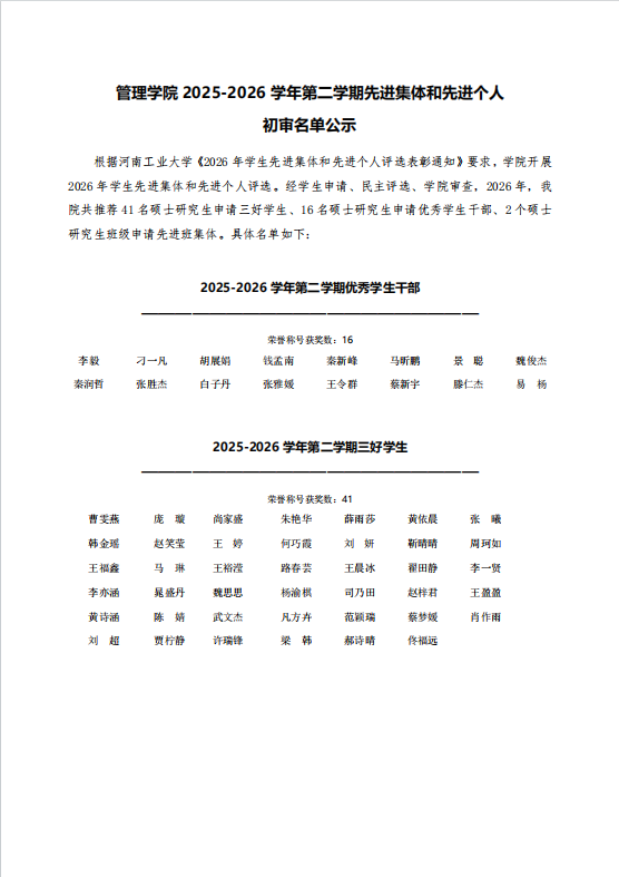 亚洲无码 2025-2026学年第二学期先进集体和先进个人 初审名单公示