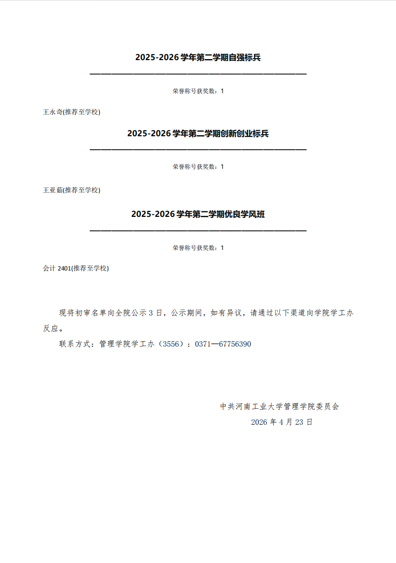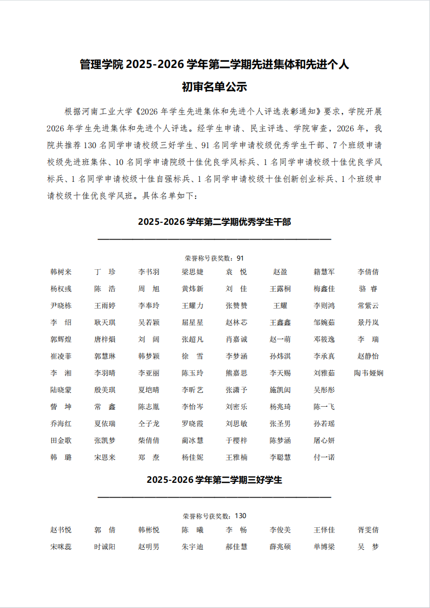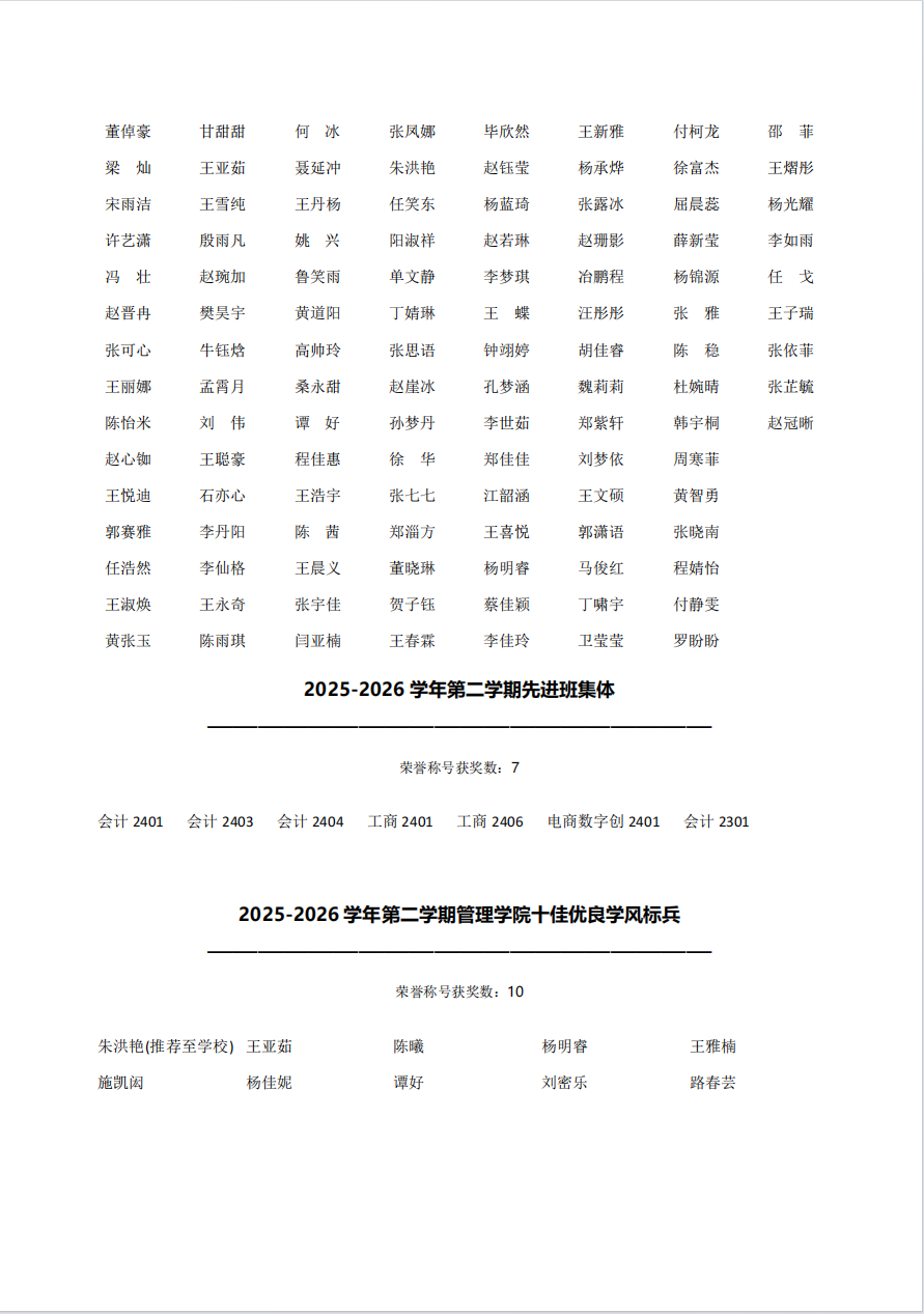 亚洲无码 2025-2026学年第二学期先进集体和先进个人初审名单公示