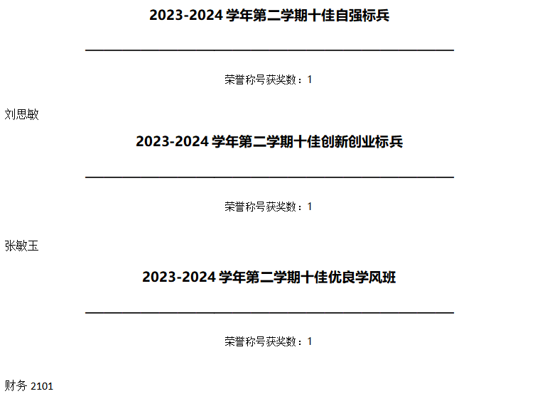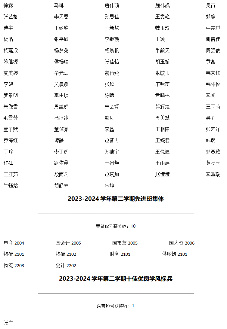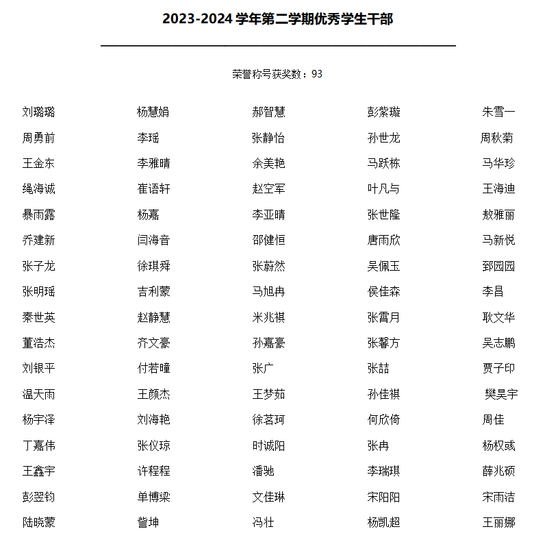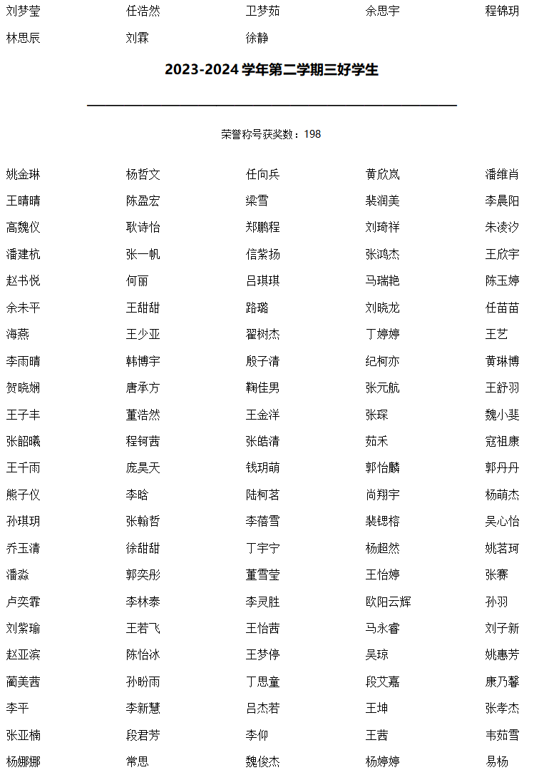 共推荐198名同学申请三好学生、93名同学申请优秀学生干部、10个班级申请先进班集体、1个班级申请十佳优良学风班、1名同学申请十佳优良学风标兵、1名同学申请十佳自强标兵、1名同学申请十佳创新创业标兵。具体名单如下: