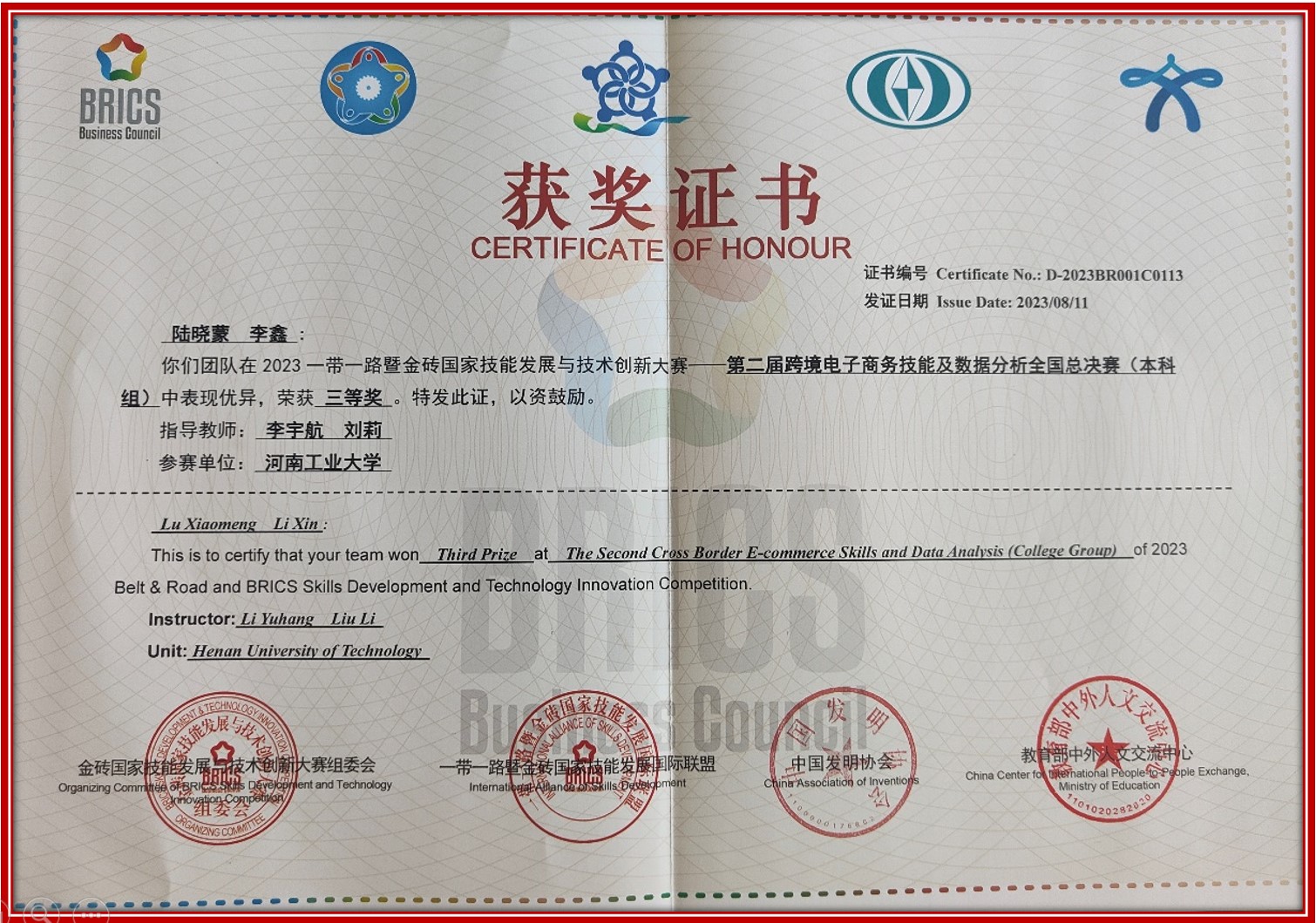 李宇航和刘莉两位老师指导,电子商务数智化实验班学生陆晓蒙、李鑫组成的团队获得了全国总决赛三等奖。