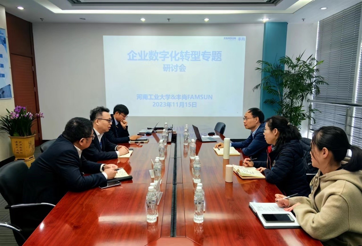 为丰尚公司培养优秀的员工表示衷心地感谢;其次,双方就企业的数字化转型设想、做法、进展、问题以及未来的方向展开了深入的交流。吴飞指出,企业的数字化转型规划可分为标杆园区建设、智慧园区建设以及企业内价值链全面集成三个阶段,第一阶段中饲料数字化和智能化场景正在不断完善,后两个阶段也在有条不紊地展开。刘国荣、王建东和陈加民就人力资源管理数字化转型相关议题进行详细介绍和深入解读,认为数字安全和信息安全是影响人力资源管理数字化转型的关键问题,解决好这两个问题才能确保数字化转型行稳致远。校企双方还就管理类专业人才培养互相交换了意见。