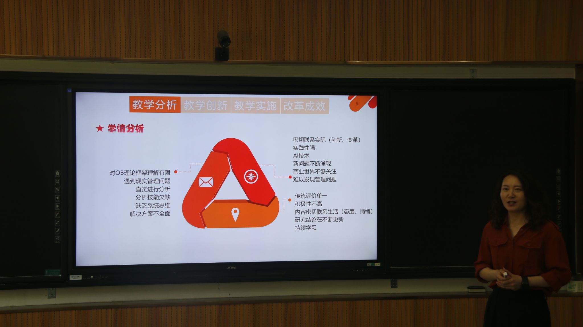 现场决赛采用10分钟课程设计创新汇报形式。比赛过程中,选手们秉持“以学生为中心”的教学理念,深挖课堂教学的痛点、难点,通过教学内容设计、教学方法创新、教学评价多元化等,对课程教学、课程思政建设等进行了设计与创新,比赛现场氛围紧张激烈,精彩纷呈。评委们依据学校第十三届教学大奖赛评价指标,对每位选手的前期材料和现场教学设计创新汇报表现逐一作出点评和提问,问题切实准确,不仅考察了选手们教学设计的创新水平,同时以问题促思考,帮助选手日后完善自身设计方案、提高教学质量。