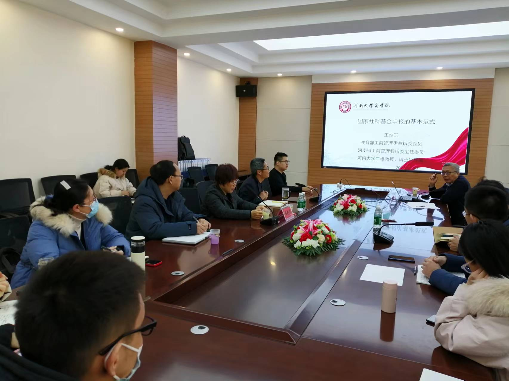 在3558会议室举办2024年度国家社科基金项目申报辅导会,河南大学商学院王性玉教授来院为项目申报老师做辅导。辅导会由院长杨艳萍主持,副院长李凤廷以及10多位项目申报老师参加了会议。