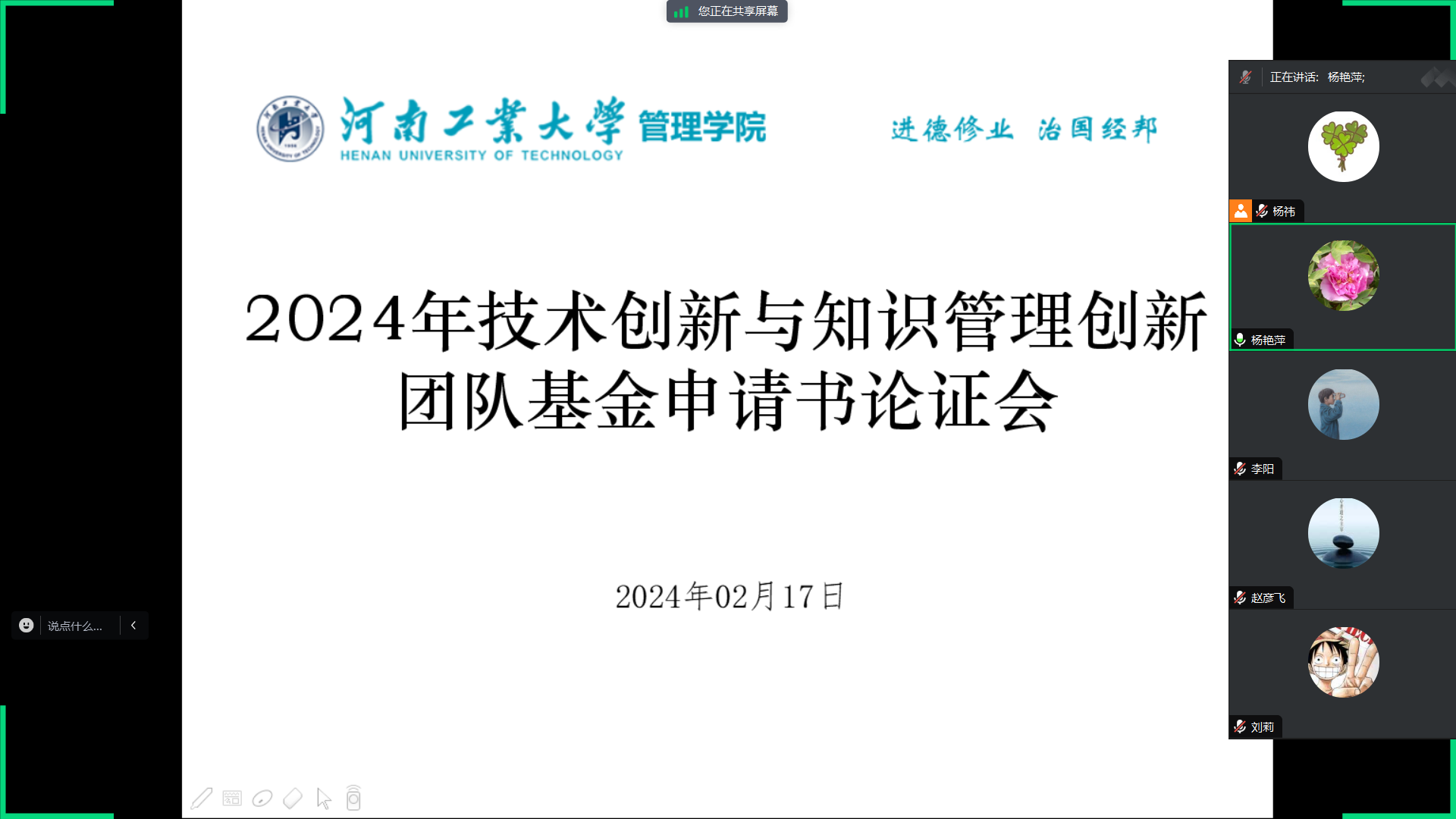 技术创新与知识管理团队在通过线上会议形式召开国家社科基金论证研讨会。团队负责人杨艳萍,团队成员李阳、刘莉、赵彦飞、杨祎等5位老师参加了本次会议。