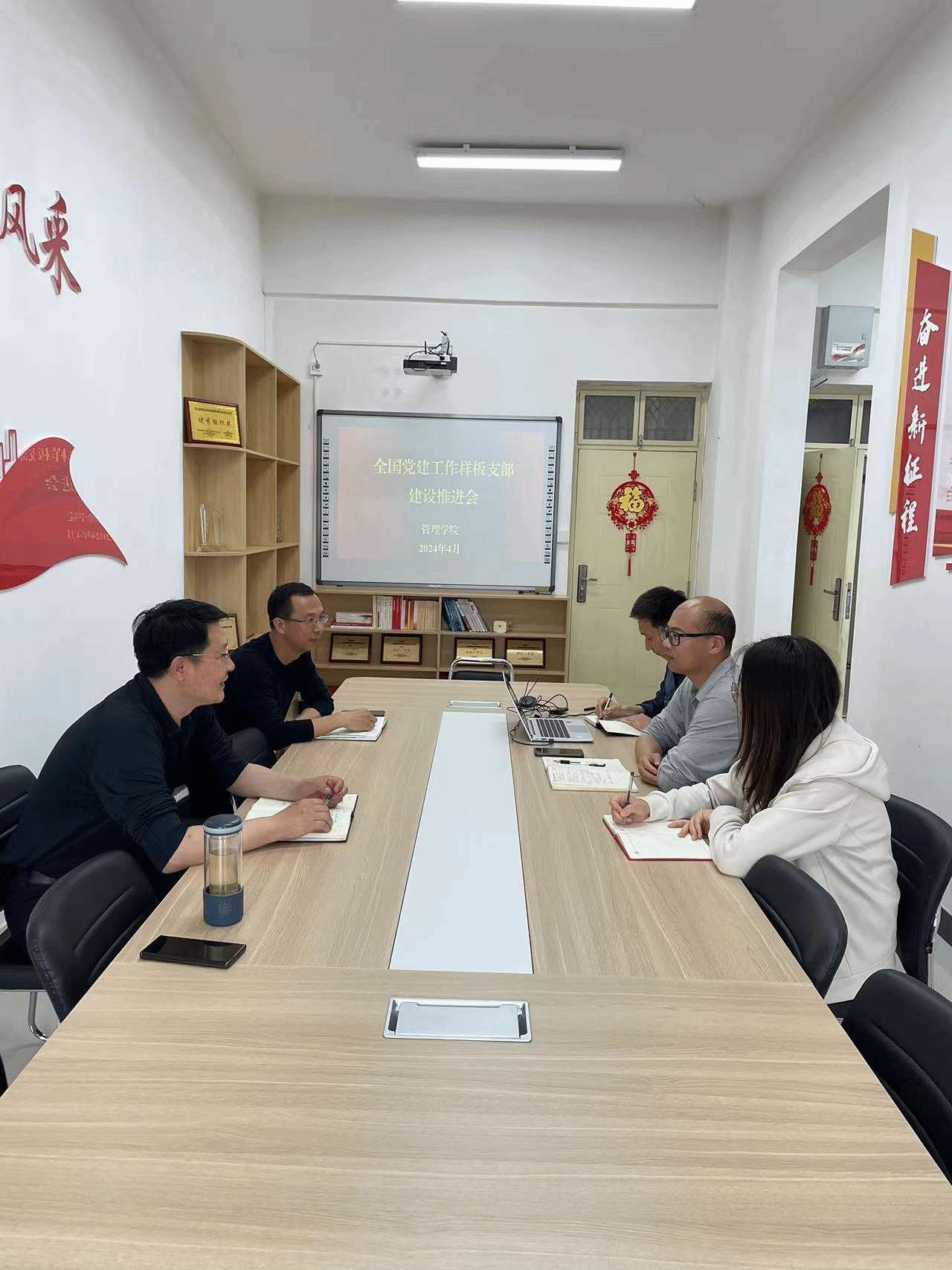 “全国党建工作样板支部”建设工作,4月16日下午,学院党委副书记魏涛、副院长韩江深入电子商务系指导推进支部建设工作。电子商务系教工党支部书记李朝阳,系主任李永海,支部委员王景玫、申聪参加会议。