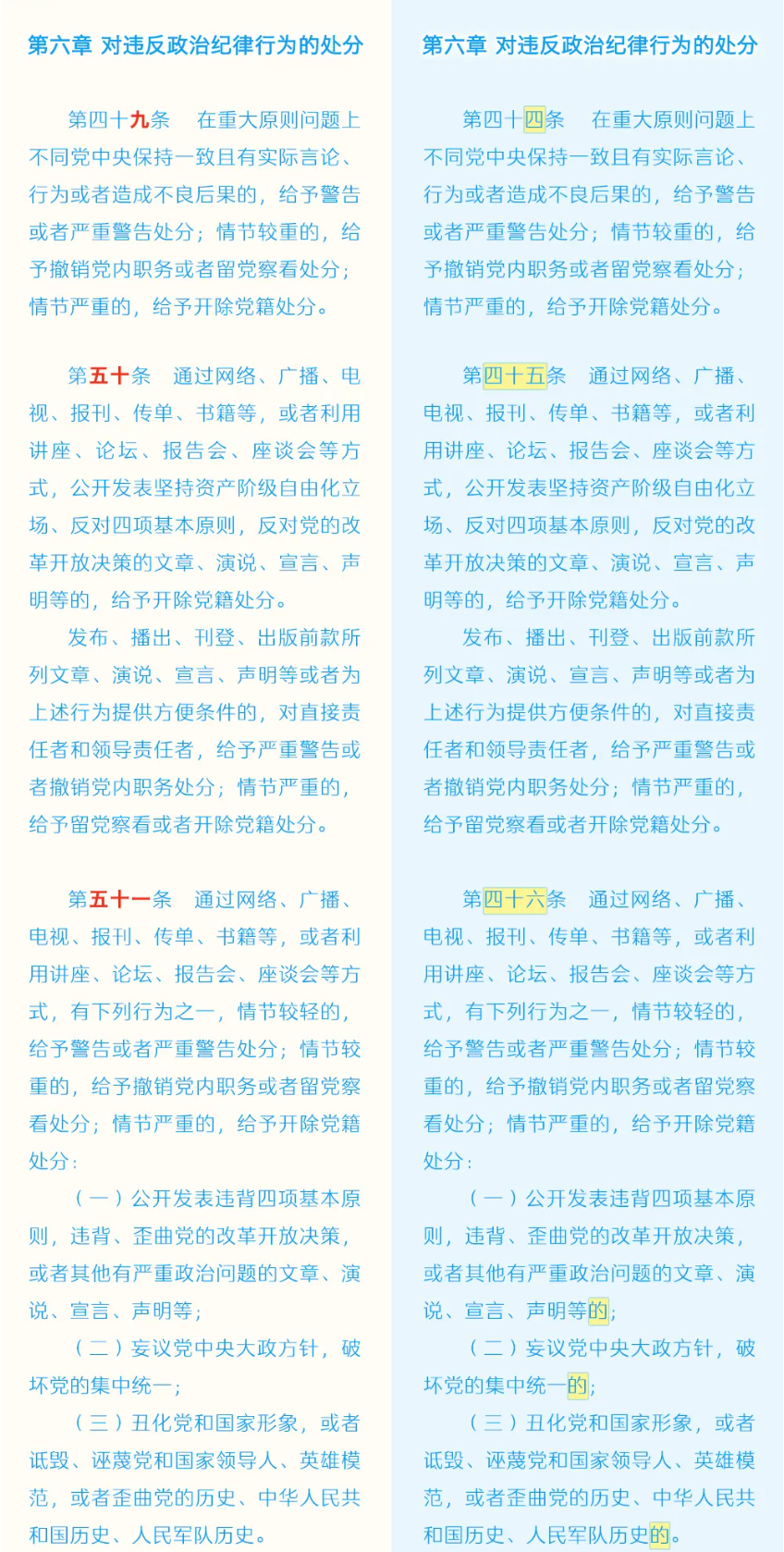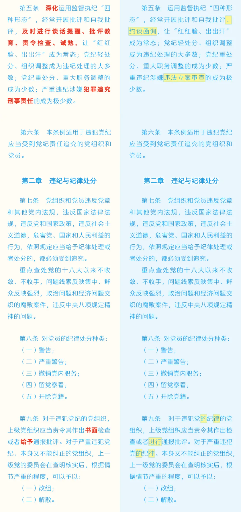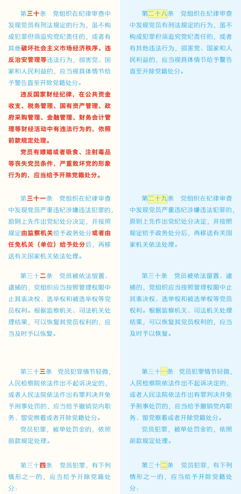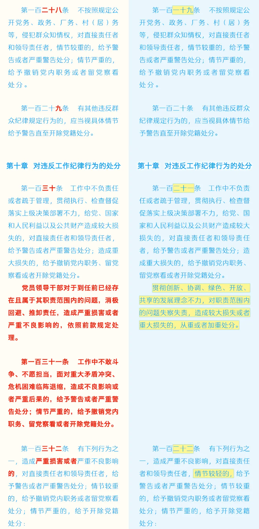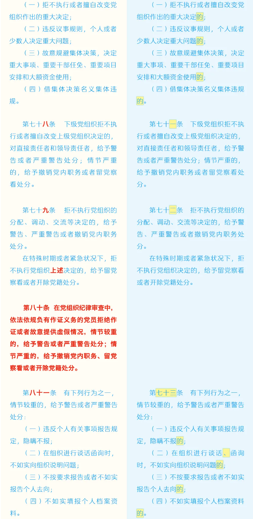 党纪学习教育第5期丨《中国共产党纪律处分条例》修订条文对照表
