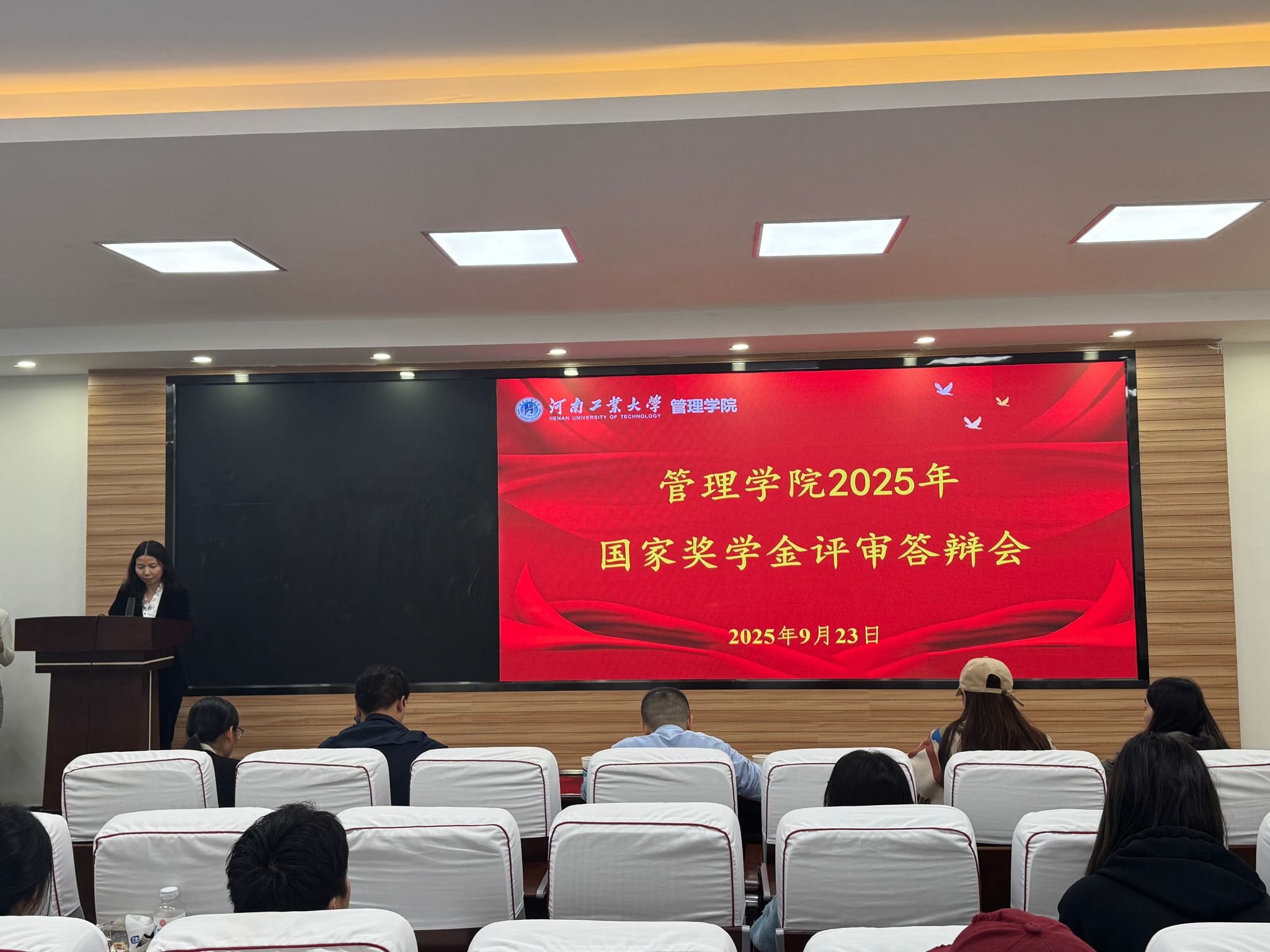 在博识楼3428会议室举办2025年国家奖学金评审答辩会,学院党委副书记曹启娥、各系主任、各年级辅导员、学生代表及候选人参加会议。
