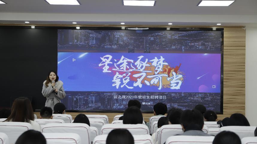 在3428会议室举行百度锐之旗2023管培生项目宣讲会。河南锐之旗网络科技有限公司总监靳路漫及其工作人员、2023届毕业生、2020级电子商务专业全体在校生参加会议。