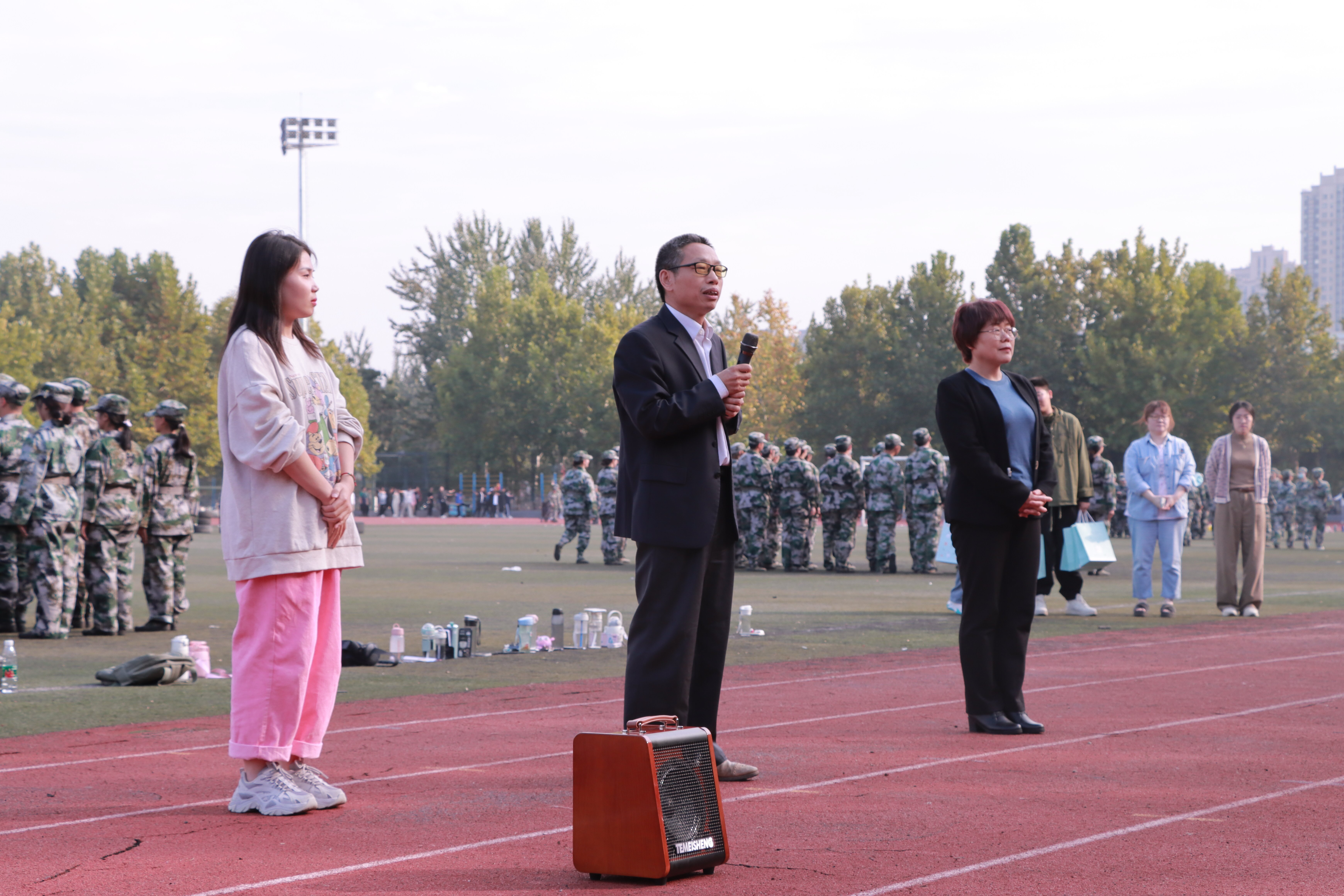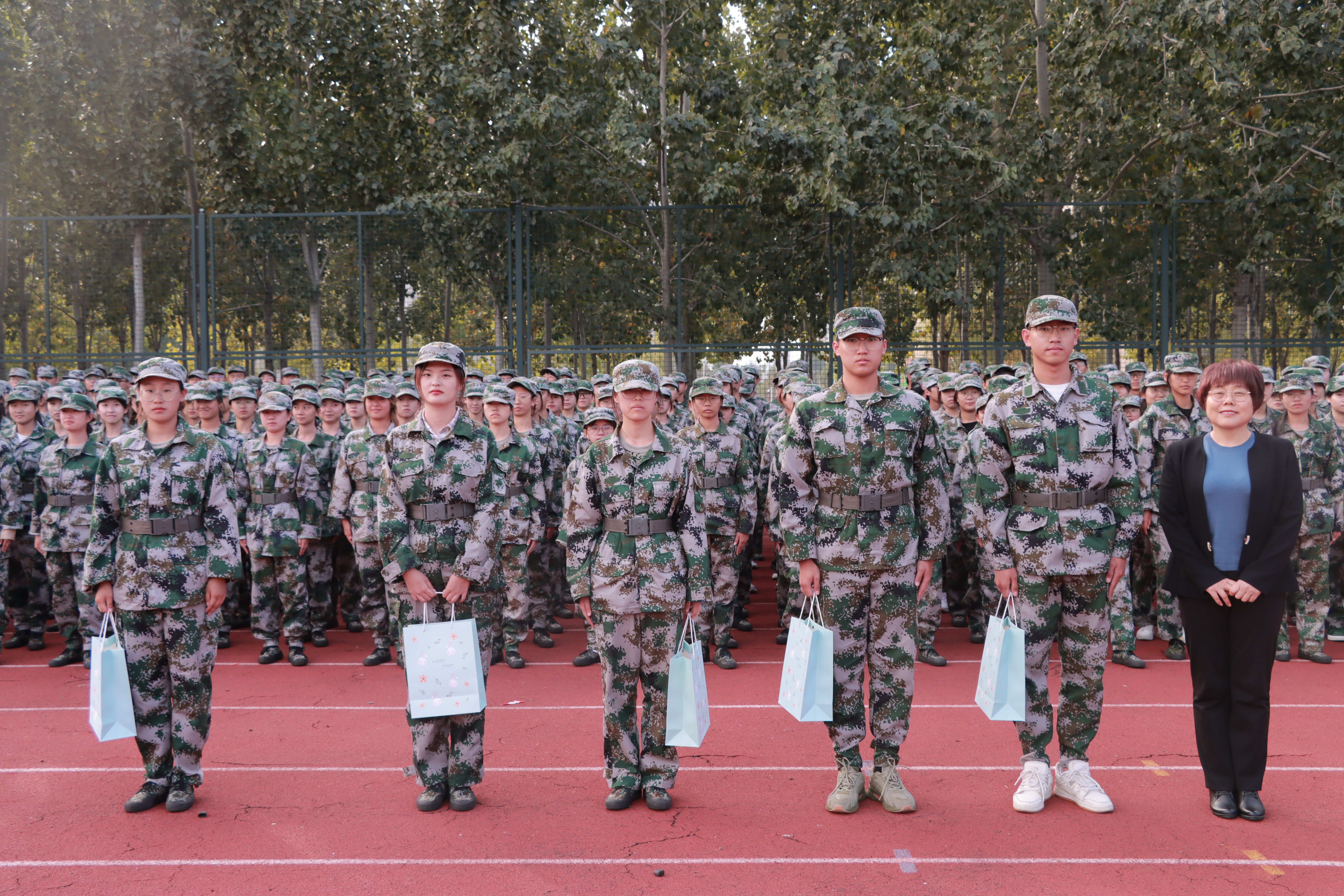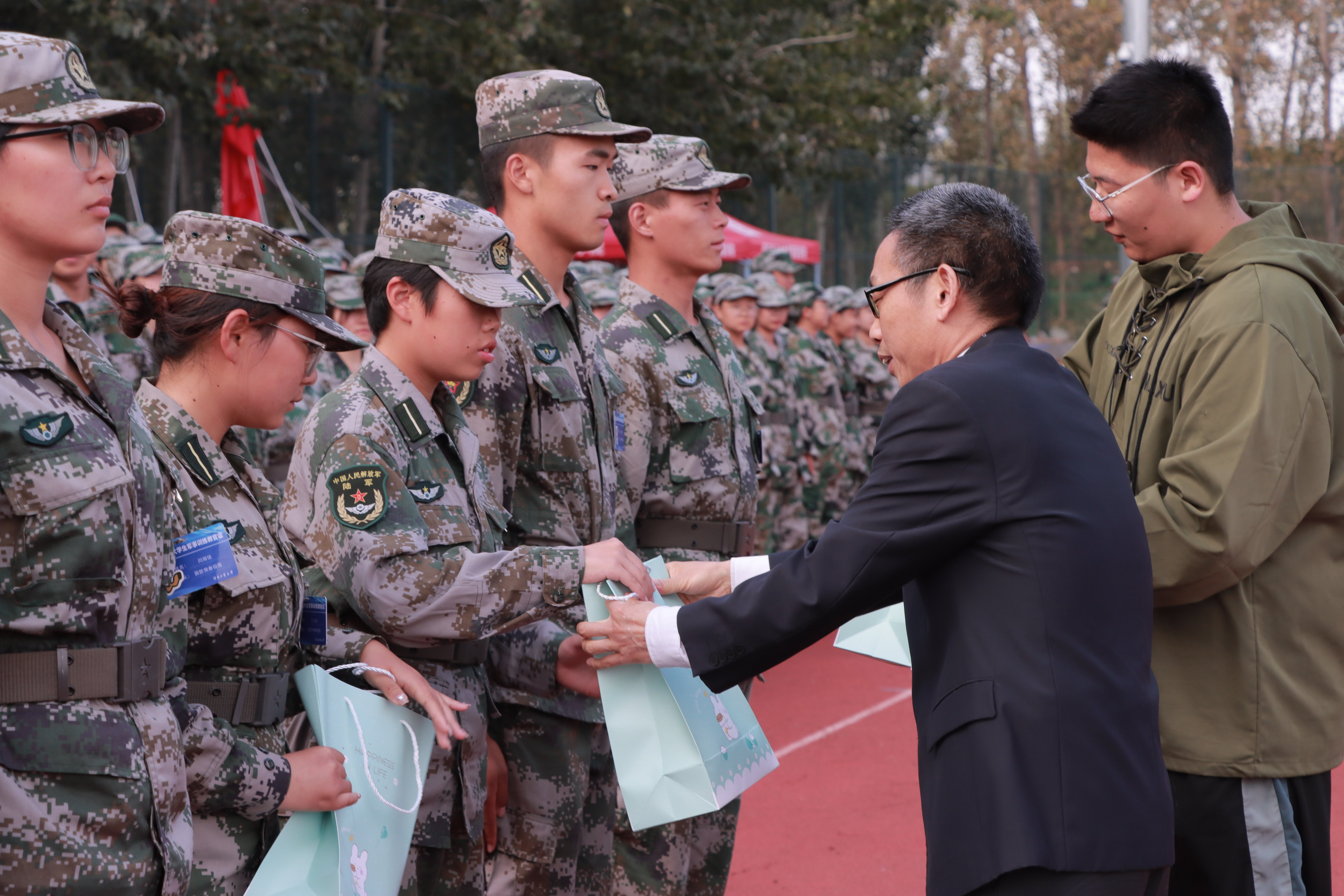 随后,学院领导为教官及学生代表发放慰问品,希望同学们在接下来的军训中坚决服从教官指挥,不折不扣完成军训任务,并嘱咐学生会主席团成员为每位同学发放慰问礼物,给予在训同学们关怀与慰问。同学们欢呼鼓掌,气氛热烈。