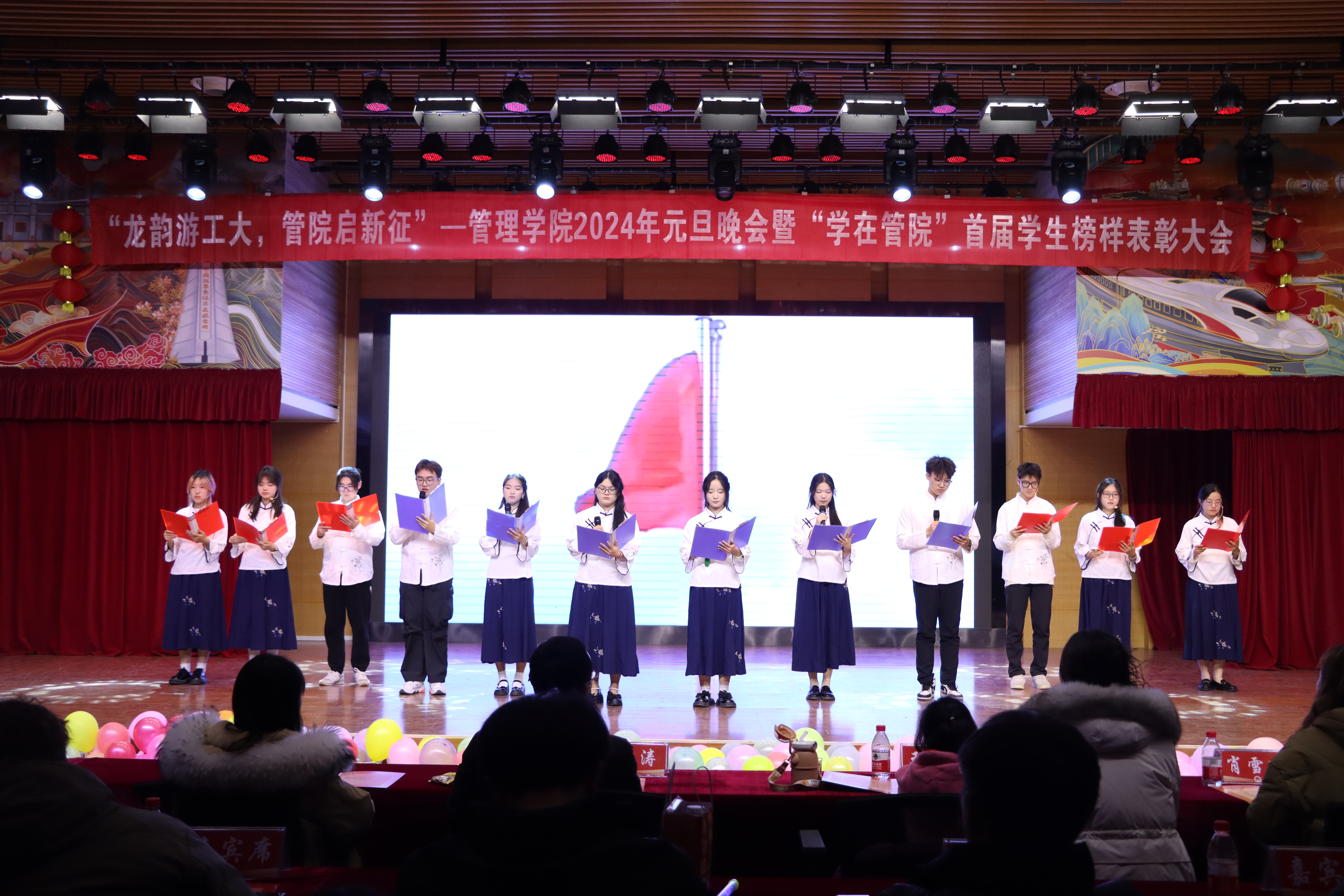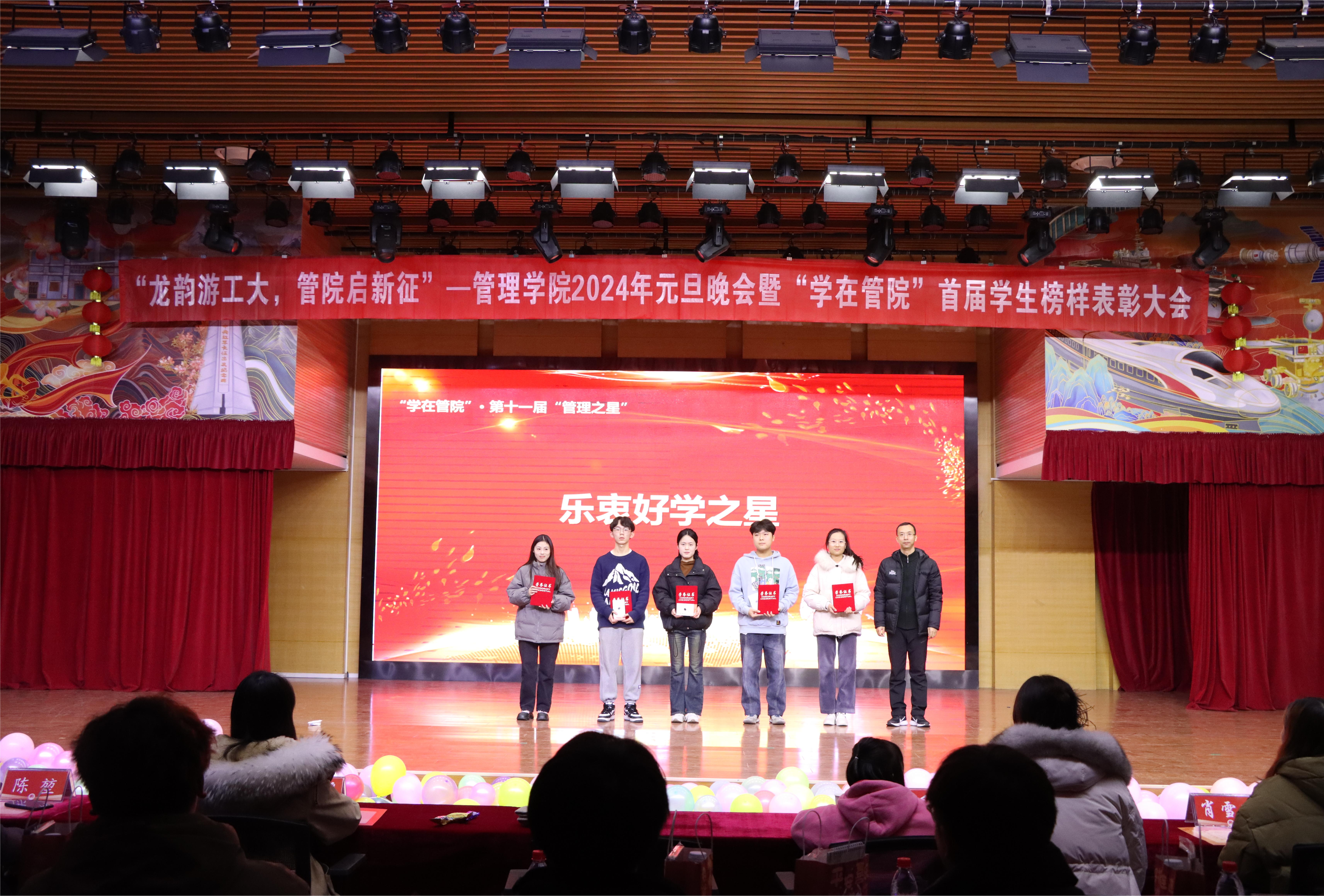 在25201活动厅举办以“龙韵游工大,管院启新征”为主题的2024年元旦晚会暨“学在管院”首届学生榜样表彰大会。学院党委副书记魏涛、学工办主任王风云、团委副书记郑媛媛及全体辅导员出席本次晚会,参演人员、学生骨干及学生观众共200余人参加此次活动。晚会由杨晨帆、张妍、朱坤和李凡主持。