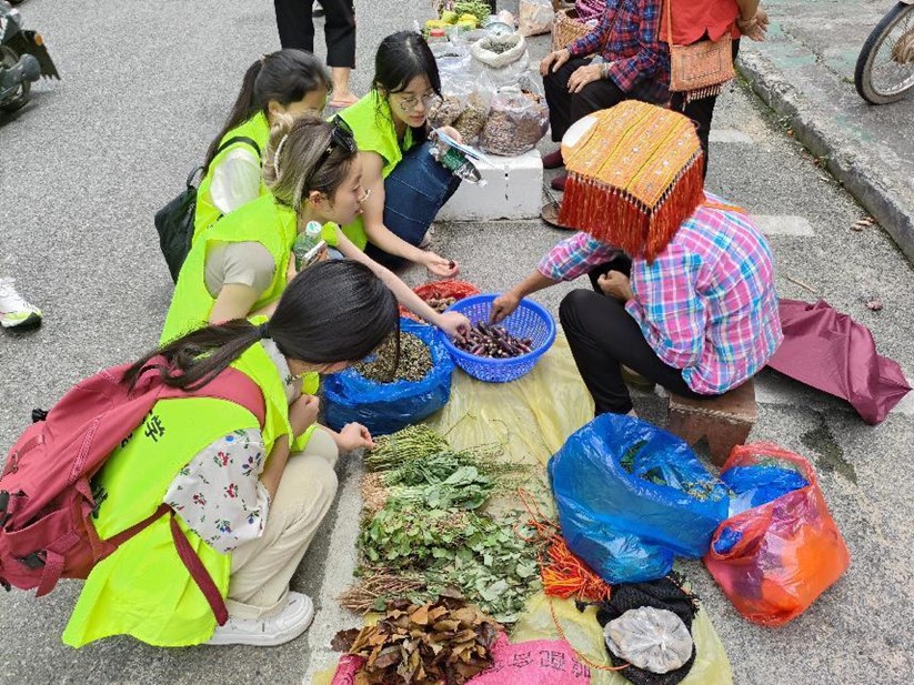 团队成员稍作整顿便前往当地的集市,以最贴近当地居民生活的方式了解瑶族人民的日常生活。在集市上,队员们发现了许多年过半百的老人在摆摊卖药材、蜂蜜等农产品。团队成员们与市场上摆摊的瑶族奶奶们热情交流,从她们的口中队员们了解到这都是自己采摘的,山里边有许多类似的药材,她们在这售卖了十几年,自民族区域自治制度确立以来,金秀县发生了很大的变化,人们生活水平提高,过得越来越好,而当地的瑶族居民对民族团结的认同感也越来越强,对未来自治县的发展以及美好生活的实现抱有很高期望。