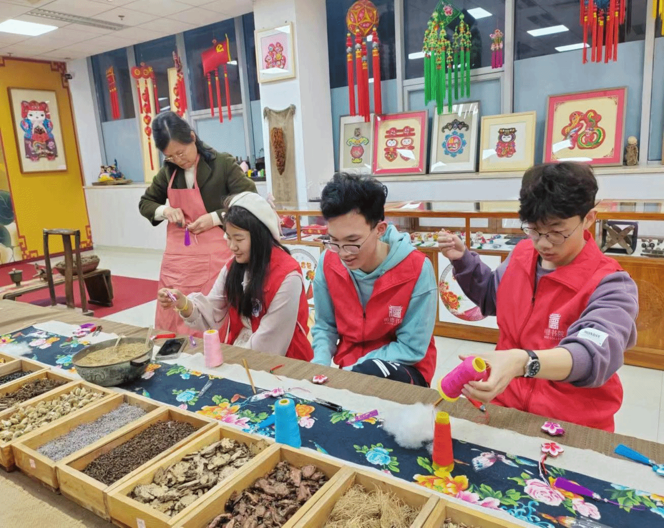 在资深传承人的指导下,队员们亲手体验了香包的制作过程。从选材、裁剪、缝制到填充香料,每一个步骤都需精心操作,不容丝毫马虎。通过亲手触摸那些色彩斑斓的布料,聆听传承人讲述香包背后的历史故事与民俗寓意,队员们深刻感受到了香包文化所蕴含的深厚情感与美好愿景。