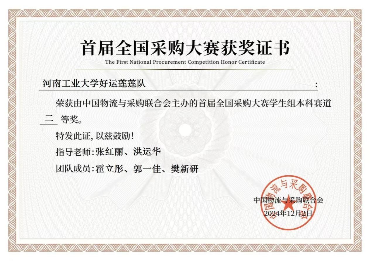 物流管理系教师张红丽、洪运华指导的“好运莲莲队”学生团队(成员:霍立彤、郭一佳、樊新研)荣获全国学生组本科赛道二等奖。