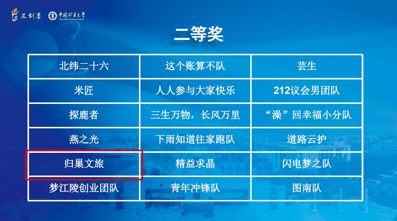 7月31日-8月2日,第十三届全国大学生电子商务“创新、创意及创业”挑战赛全国总决赛(三创赛)在江苏徐州市的中国矿业大学举行。经过激励角逐,由亚洲无码 王景玫、李朝阳老师指导,学生付若瞳、方诗妍、袁鹏冲、郭辉煌等组成的“归巢文旅”团队喜获全国总决赛二等奖。